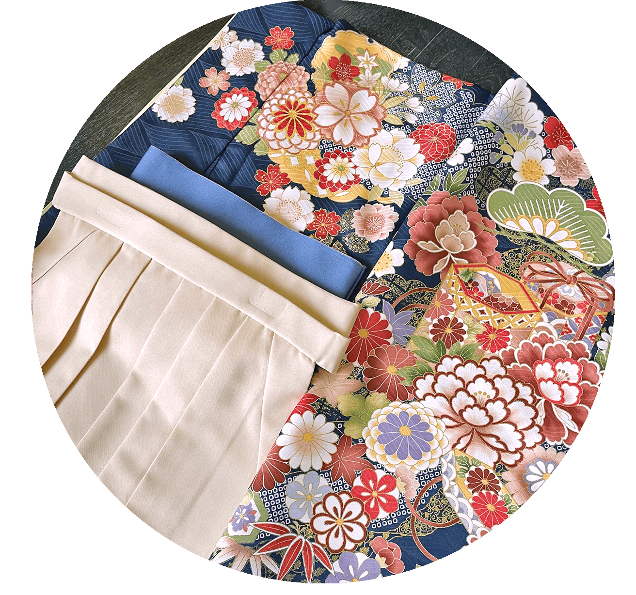 袴に合わせる予定のお着物と、その着物に肩幅や袖幅・袖の長さが合っている長襦袢と重ね衿(伊達衿とも)をお持ちください。袋帯や名古屋帯・帯〆・帯揚げは、袴のときは使いません。